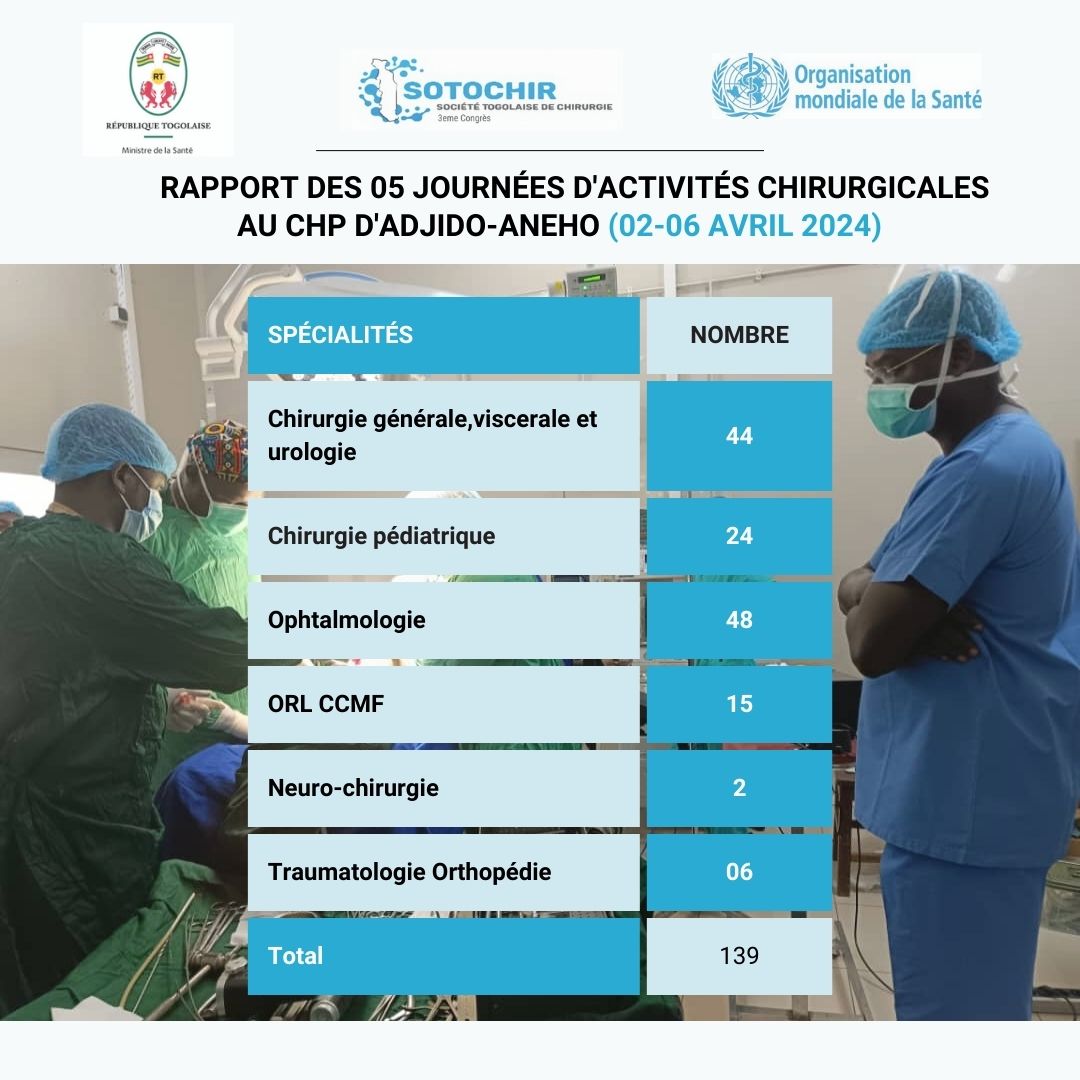 Rapport des 05 journées d’activités chirurgicales au CHP d’Adjido-Aného (02 – 6 avril 2024) Trouvez ci-dessous le rapport des 05 journées d’activités chirurgicales au CHP d’Adjido-AnéhoCi-dessous le nombre de patients opérés par spécialités.